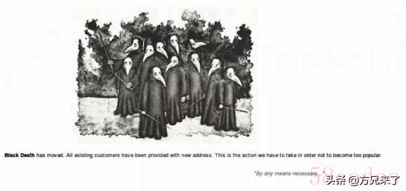 此时,网站的图片下面,还有一串英文,翻译过来的意思就是:黑死病组织已经转移了网站,已存在注册用户,都会收到我们发送的新网站地址。我们采取这种措施,就是为了避免网站太出名。