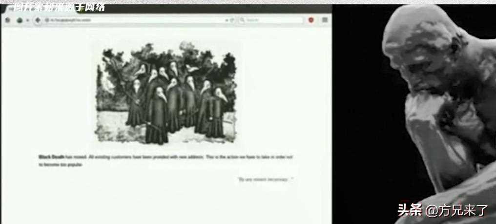 这个视频里面,又一次出现了黑死病组织的官网截图,此时,网友根据视频里面的网址试着打开,结果发现,网址再次失效了。这件事情再次引起了大家的关注,不过后来这个人也被锤了,出名以后,发的很多视频,都是用的电影画面,目的就是为了博取流量。
