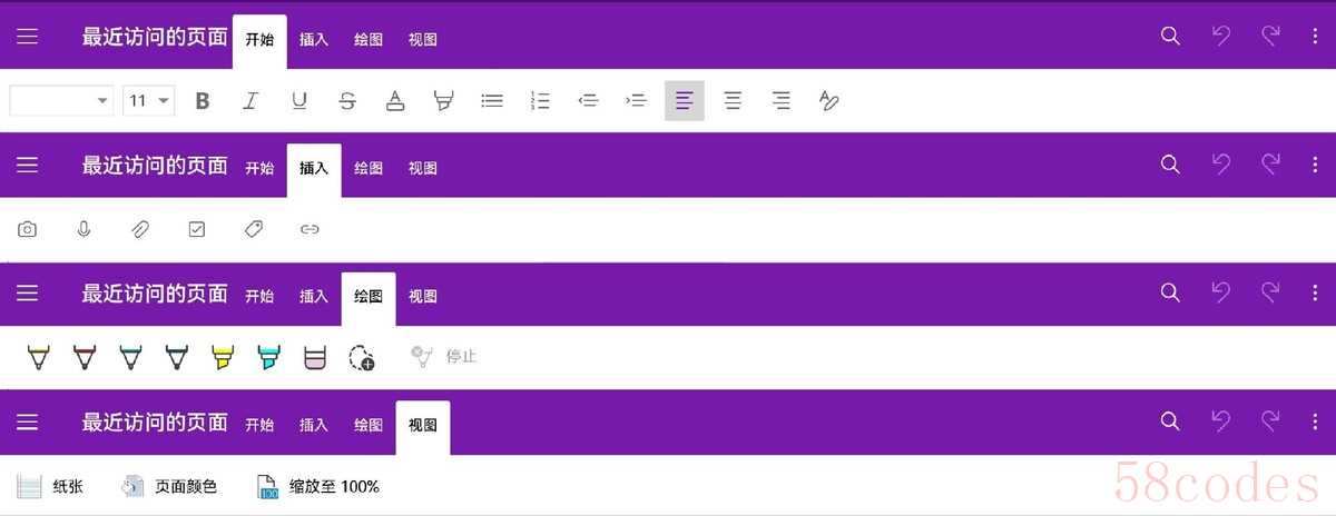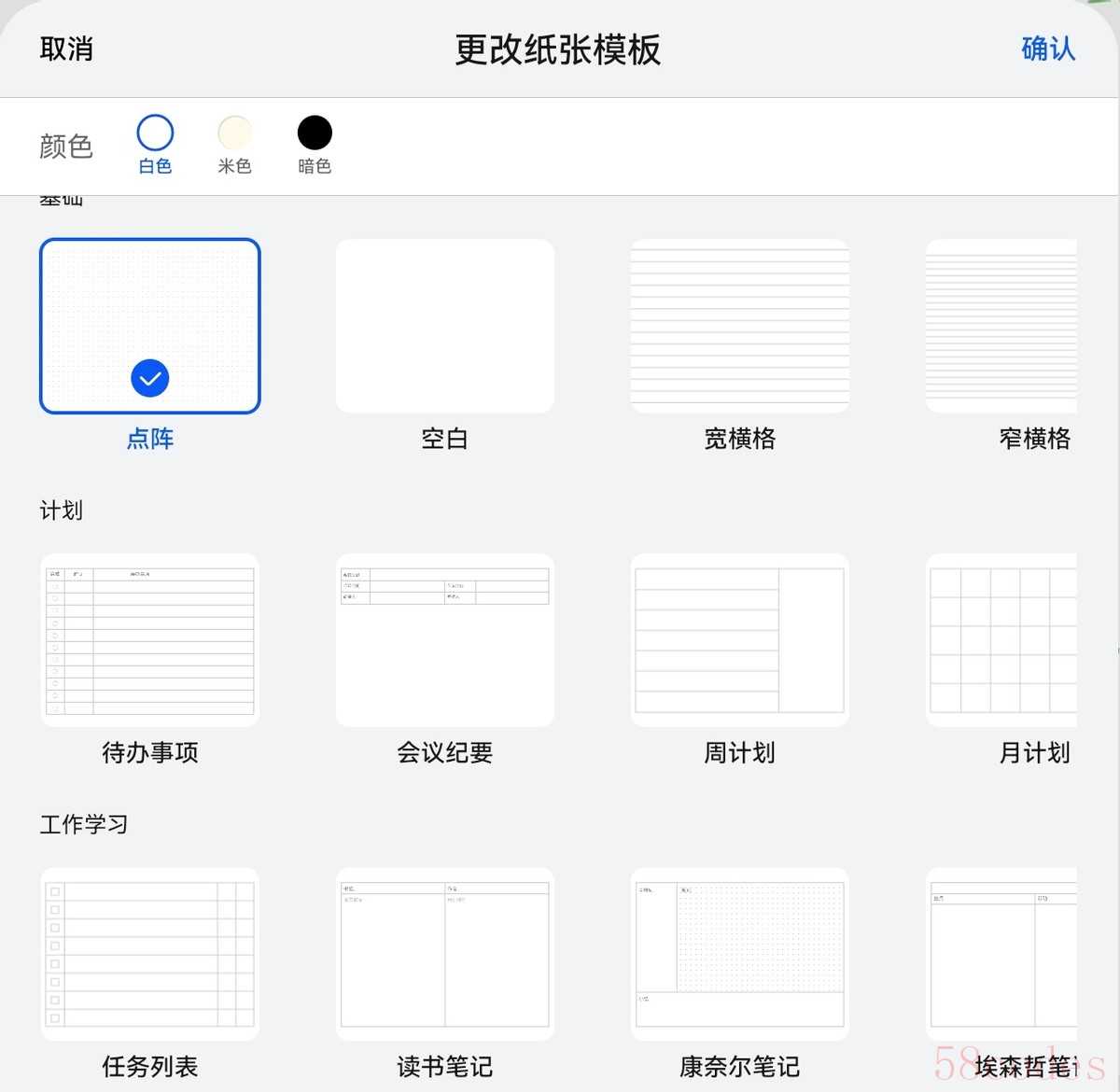 纸张:纸张与OneNote不同,是模仿笔记本的形式,一页一页的,可以设置左右或上下切换。纸张大小不能改变,但提供了固定的颜色变化或模板选择,如下图所示(向后滑动还有更多),但不能自定义模板。