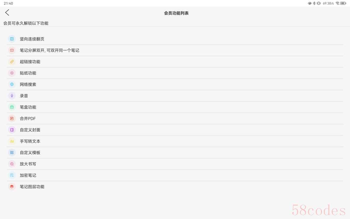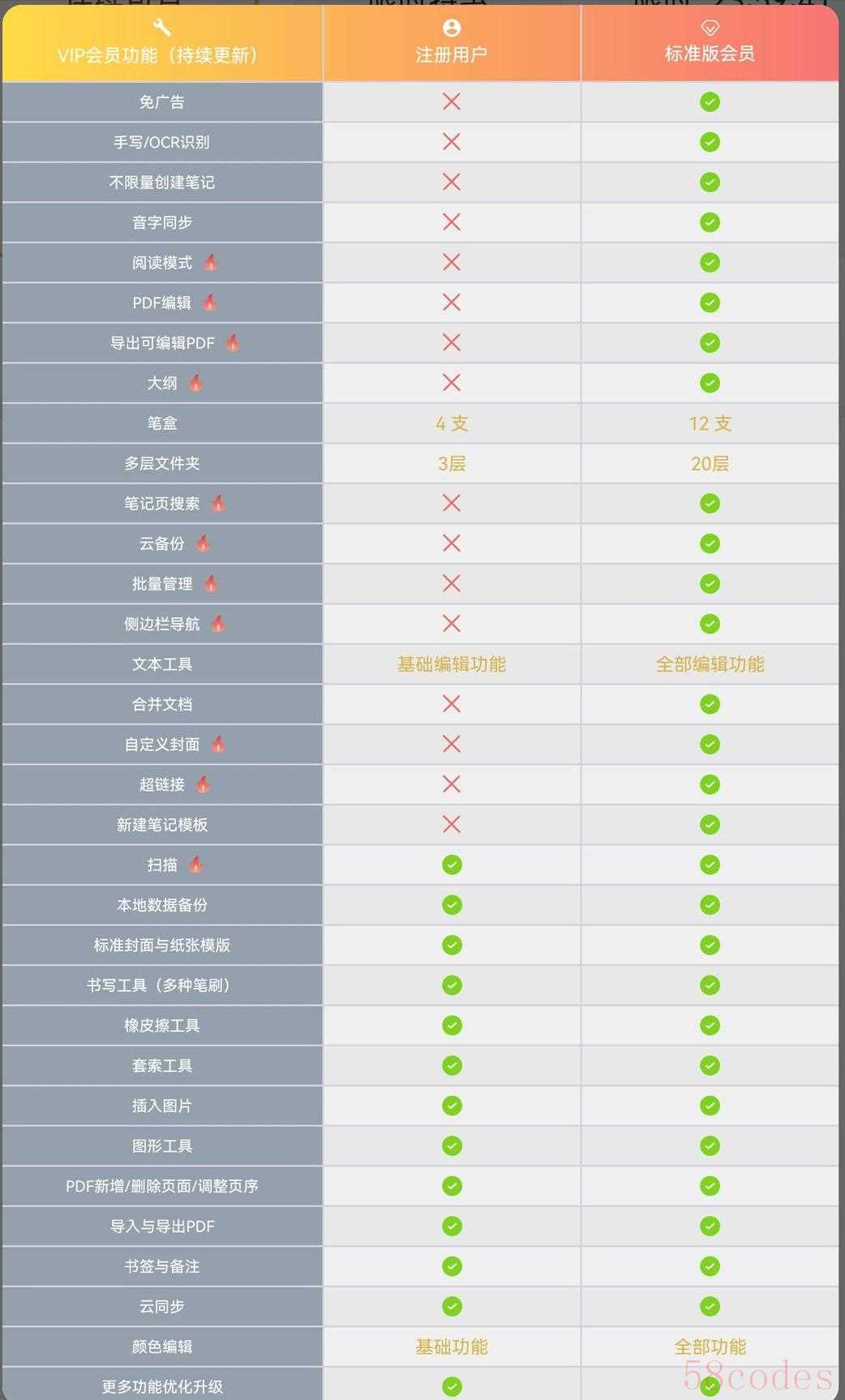 还有激光笔、搜索(可以搜索手写文字并高亮显示)、图层、录音、手写转换文本、放大书写、笔记双开、超链接等功能,其中超链接功能我非常喜欢,可以利用它来给笔记做目录,这样在笔记内容很多的时候找起来就非常方便。但这些功能有些也是需要开通会员的,具体的会员功能见下图: