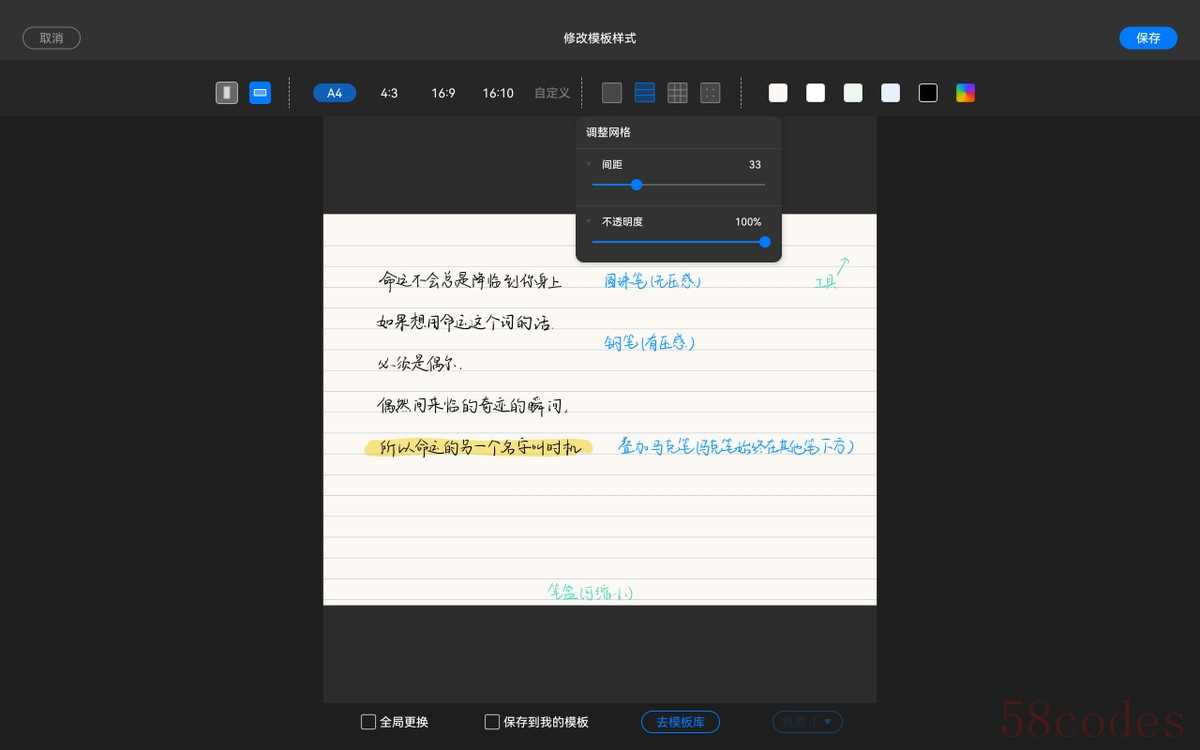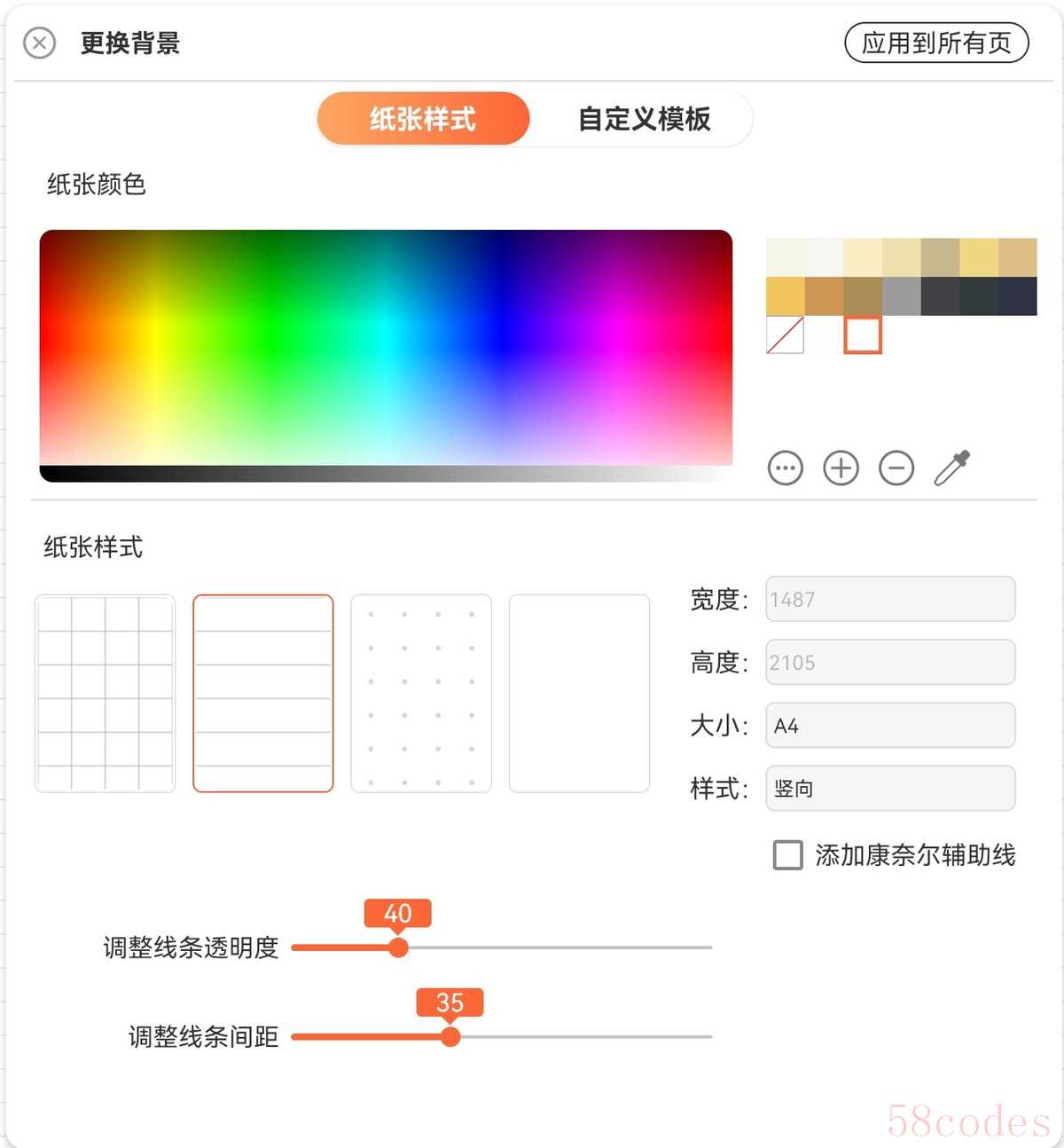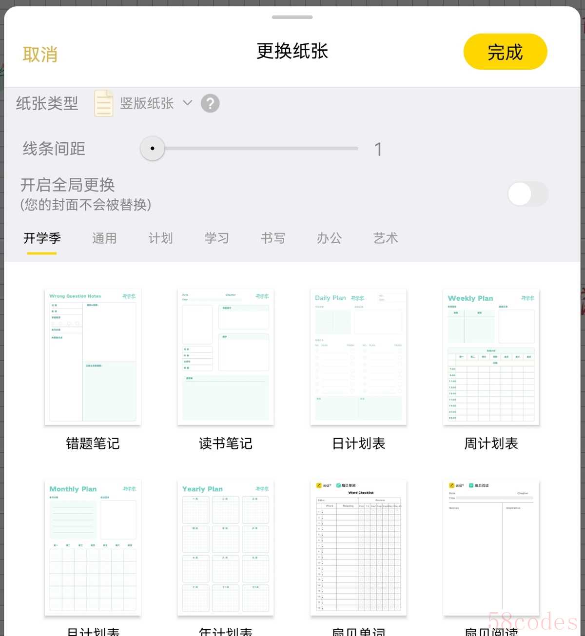 纸张:可以切换横板竖版,翻页方向,选择单页或连续滚动。纸张的模板选择也比较多,如下图所示,可以选择几种不同的尺寸,设置网格间距和不透明度,自由更改背景颜色,还能从外部导入模板,笔记封面也有不少选择。