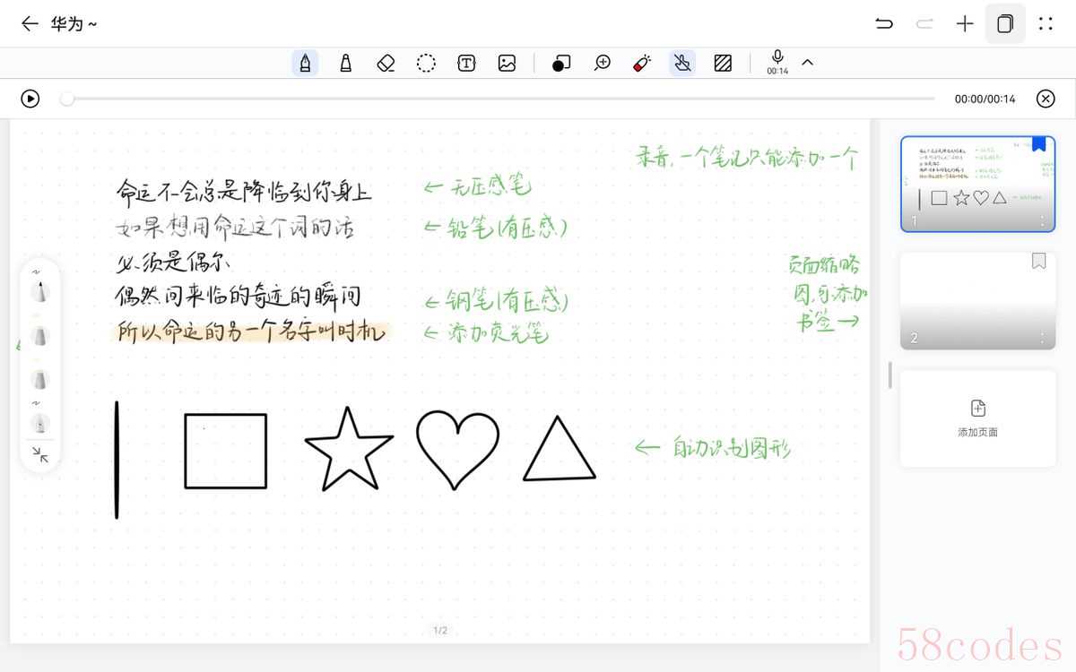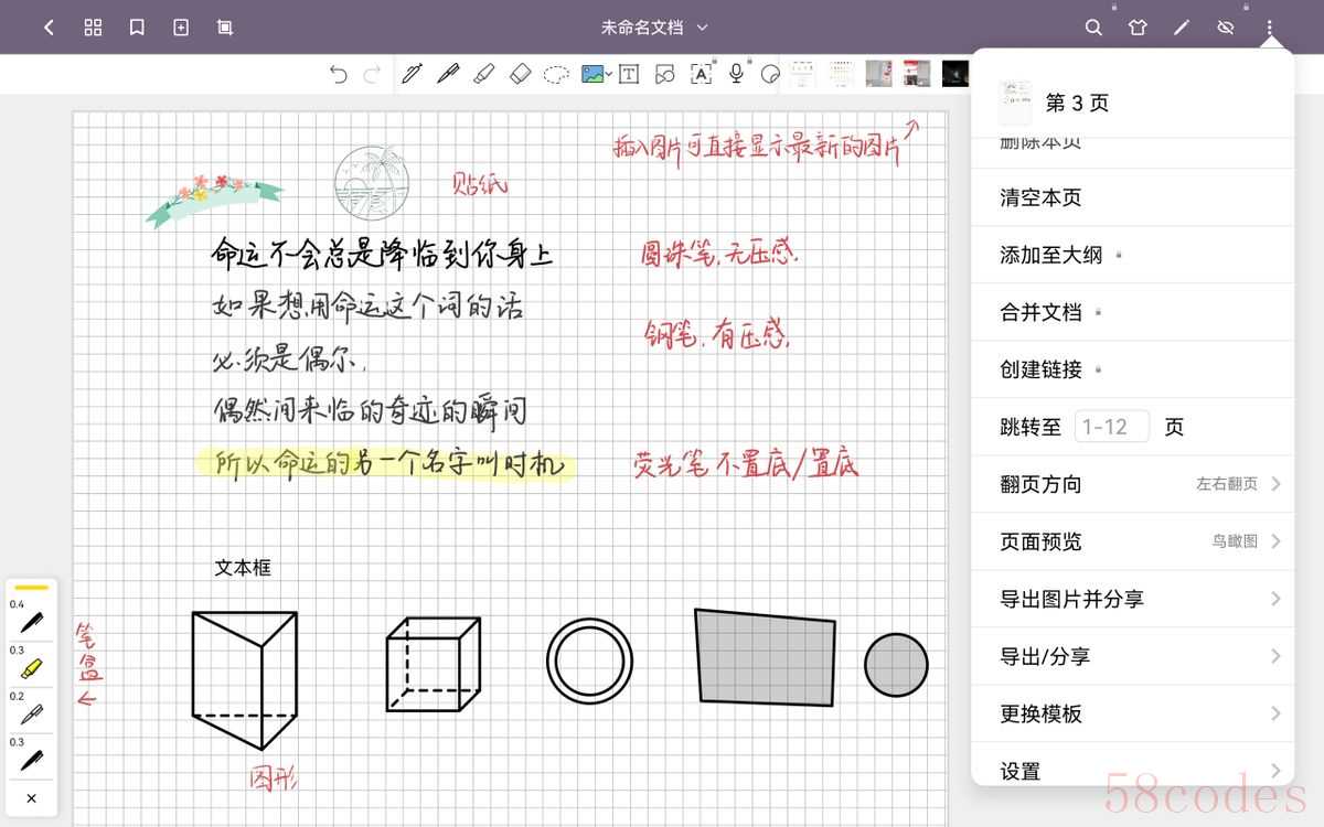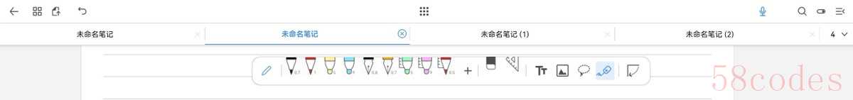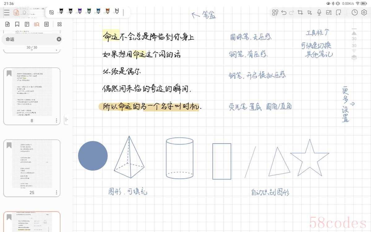 笔:无压感的圆珠笔,有压感的钢笔(压感可调节)以及荧光笔。荧光笔可以画直线可以设置是否置底。颜色可以自定义可吸色,还提供了颜色集;有笔盒,但不开会员个数有限制;默认开启自动识别图形功能。