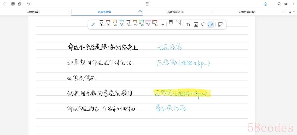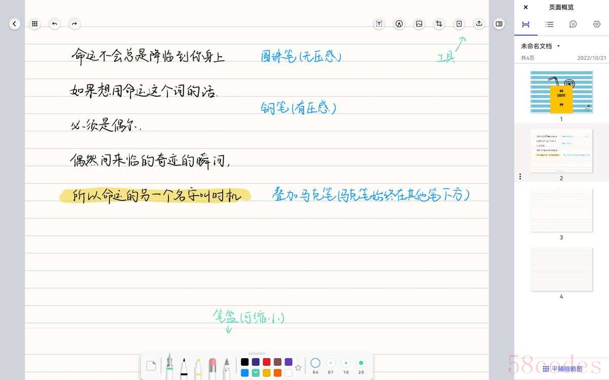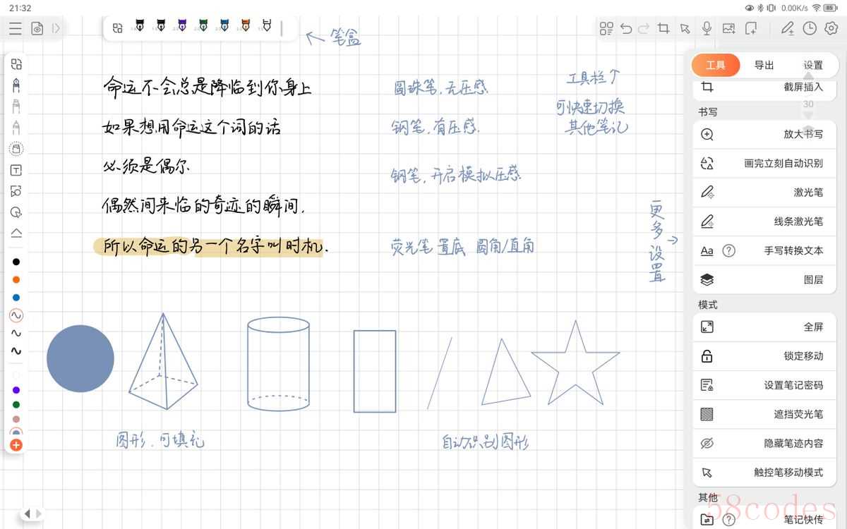 笔:享做也是有三种笔,无压感的圆珠笔和荧光笔,有压感的钢笔,压感可调节。它的钢笔还有一个“模拟压感”的功能,开启后的字迹会更像真实的在纸上写出来的笔迹,我现在基本上都是用开启了模拟压感的钢笔来书写。同样可以自定义颜色,可吸色,有笔盒。