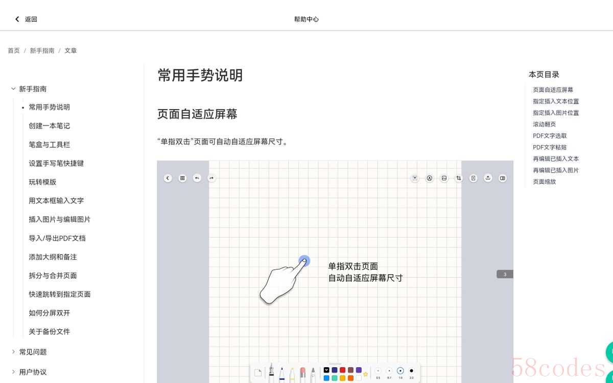 像插入文本框、手指模式等基础功能就不再赘述了,除此之外还有一些细节,比如手势操作,配合手写笔的快捷键、缩放跟随(笔刷粗细跟随页面缩放)等。