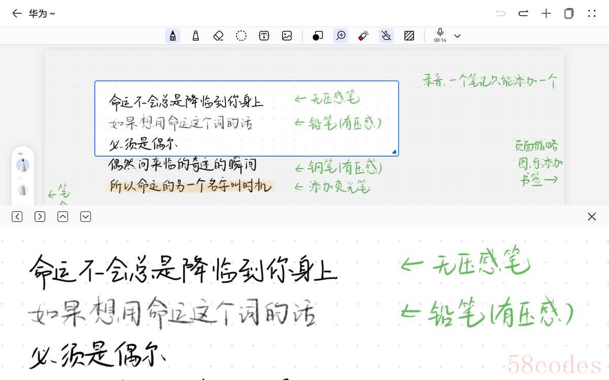 由于这是鸿蒙3.0系统才新加入的软件,功能还是比较少,比如没有搜索、超链接等功能;细节也不够完善,比如橡皮的切换没有快捷的方法,这一点的体验很不好,写错后不能快速撤回;还有一些地方的可操作性也比较小,比如笔的压感不能调节等。