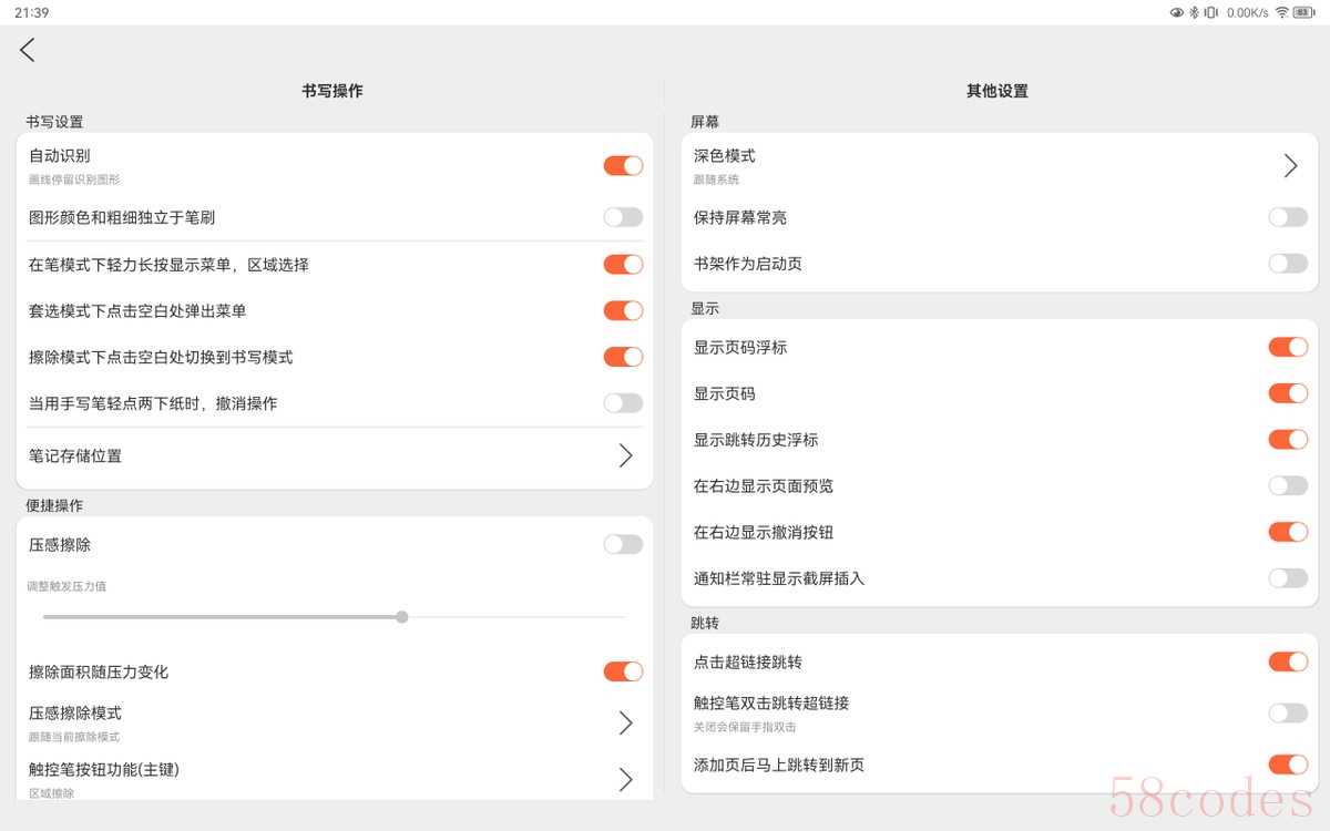 橡皮:可以设置像素擦除或笔画擦除,也可以一键清空页面。可以开启压感橡皮,即写完一笔后,稍微用力按压笔就可以快速切换成橡皮,这个功能真的很实用,习惯了之后再用没有这个功能的软件会很不习惯。