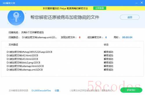 作为全球最大的勒索病毒恢复工具,360安全卫士“解密大师”根据国外流出的解密私钥,已第一时间集成解密工具,可破解目前主流的GandCrab病毒,帮助中招者一键扫描并解密恢复文件。