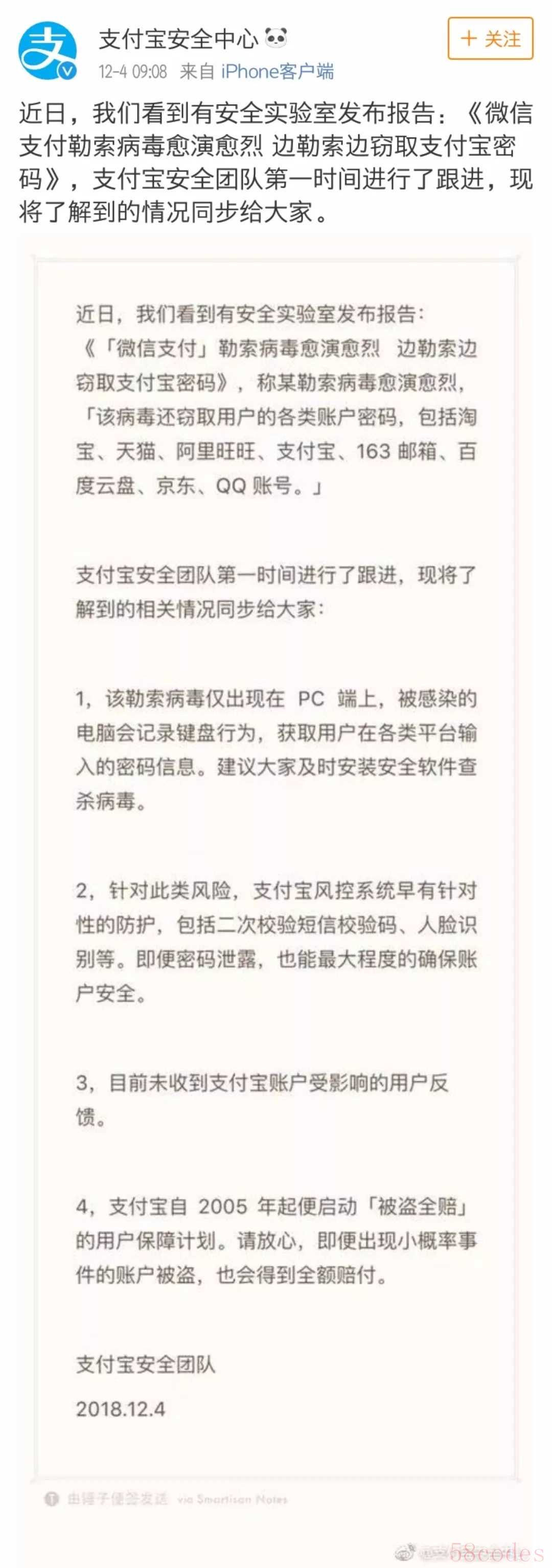 “针对此类风险,支付宝风控系统早有针对性的防护,包括二次校验短信校验码、人脸识别等。即便泄露密码,也能最大程度确保账户安全”,支付宝安全团队称,目前未收到支付宝账户受影响的用户反馈。