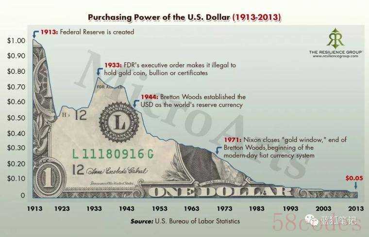 美元的购买力(从1913到2013年)。在此期间,美元损失至少95%的购买力。