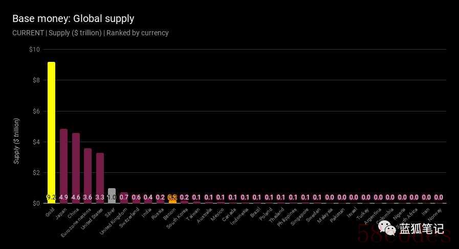 比特币市值与其他国家法币和贵金属的比较。来源:cryptovoices