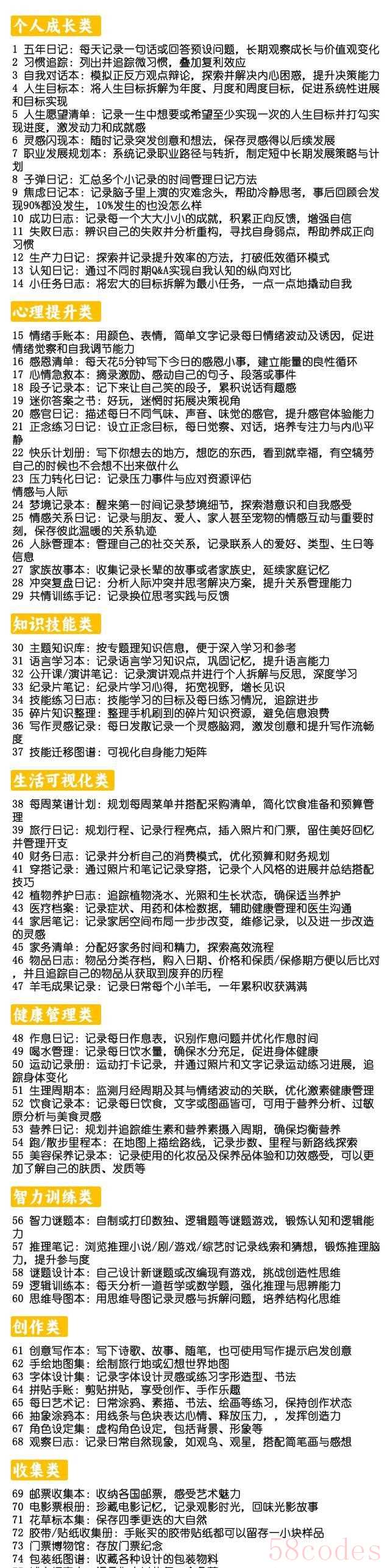 "按类型:" 日记本、笔记本、手账本、练习本、画册、工作笔记、旧相册等。