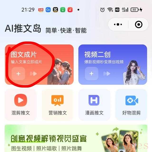 打“#AI推文岛”,进小程序,选“图文成片”。