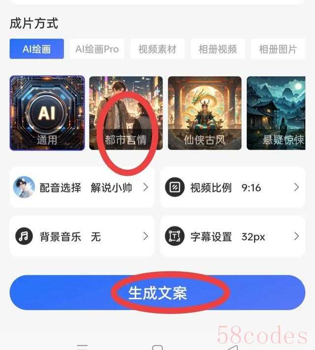 文案秒出后,再选素材:AI绘画、相册照片、网络视频都行。