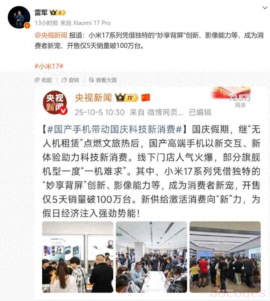3. "央视报道":关于小米17系列销量破百万的消息,确实有"央视相关频道或平台进行了报道或提及",这为该消息增添了权威性。