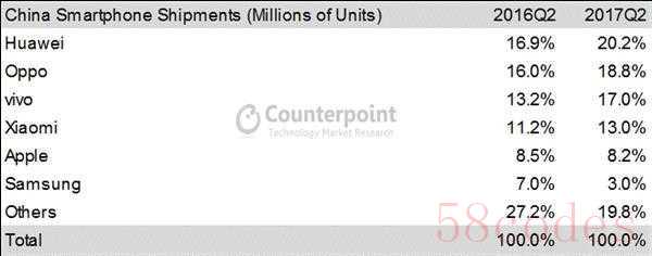 而放眼整个三星手机业务,今年第二季度三星智能手机整体手机出货量达9320万台,这个数字足以让三星稳居全球第一,全球市场份额占比高达22%。不过,根据前不久Counterpoint公布的2017年Q2中国智能手机市场出货量报告,华为、OPPO、vivo和小米这四家成为出货量最大的厂商,而排名第六的三星则继续下滑,市场份额仅剩3%。
