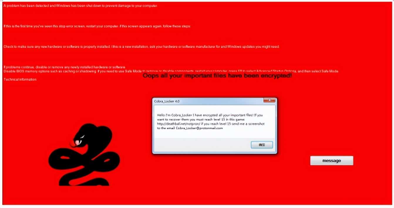 有一天你在公司办公,打开文档,展现在你面前的不是文件内容而是一个带有锁的标志。不走运,你电脑中病毒了,病毒名字叫勒索病毒。勒索病毒还有两种方式可以判断,一个是桌面背景变成黑色同时显示红色字体的英文,铺满桌面,桌面上出现握手标志;另一个是电脑出现类出现类似图片弹窗跳出来。