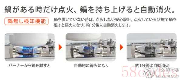 这个功能堪称是日式燃气灶的明星功能,离锅感应的功能就是当锅拿起时,火力会自动减小,1分钟后会自动熄火。是不是看着很心动?