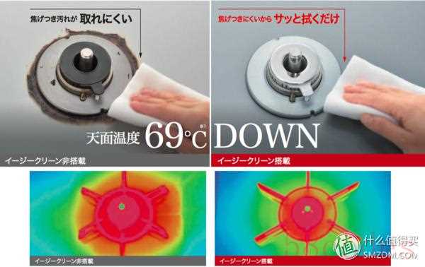 现在日系燃气灶的灶头大都采用类似凸起设计,但林内、能率的部分中高端型号还会搭配更进一步的功能——因为一般开火状态下汤汁溢出不会立即就擦干,而等到关火时可能油污已经烤干很难清洁了。而这类新产品通过重新的设计控制灶头周边面板的温度,从而让清洁更加简单。