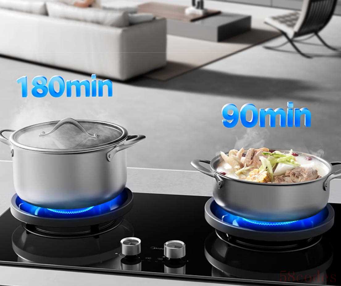 其核心功能为双边独立定时系统:左右灶头可分别设置1-180分钟定时,到点自动熄火并蜂鸣提醒,解决多任务烹饪的看管难题(如煲汤同时炒菜)。清洁便捷性突出:采用800℃高温稀土搪瓷锅架抗油污不挂污,全封闭式炉头和无螺钉卡扣盛液盘设计,油污一擦即净,大幅简化清洁流程。