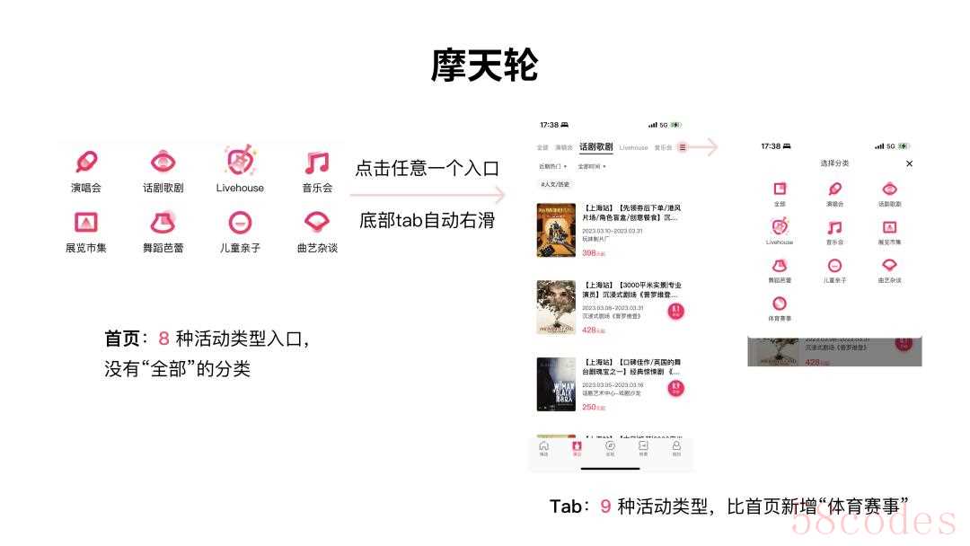 - 摩天轮(13种):近期热门、七天精选、月度看点、超值精选、节目榜单、艺人榜单、热门场馆、演唱会、话剧歌剧、爱看展、音乐会、体育赛事、为你推荐。