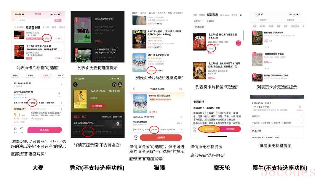 - 大麦:在演出列表界面,卡片标签“可选座”;在详情页首屏,在演出时间地点下方展示“可选座”标签,底部按钮为“选座购买”。