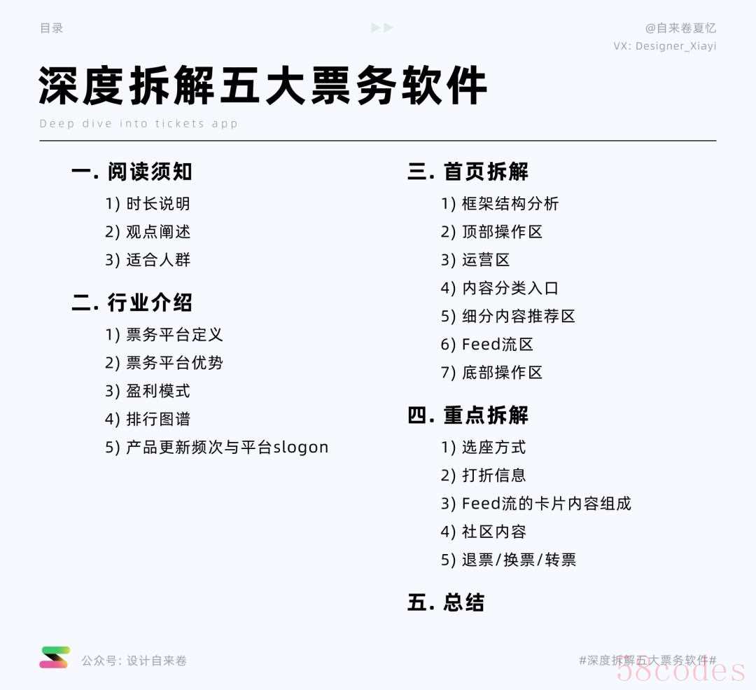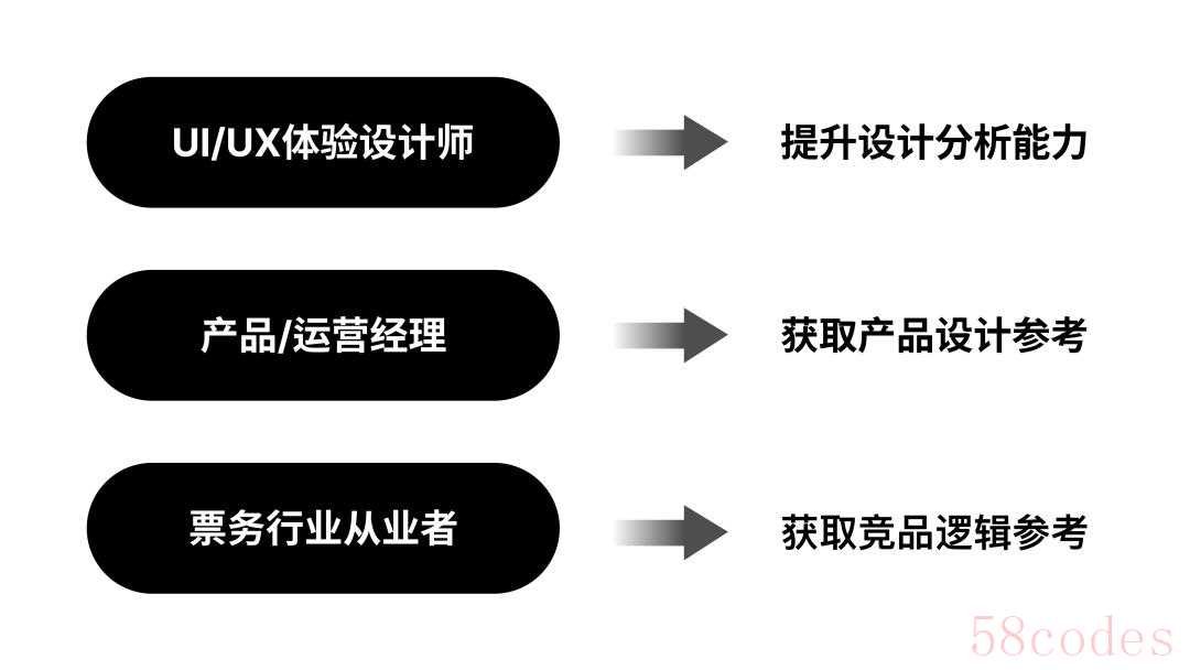 第一类:UI/UX体验设计师:跳出设计执行层,去思考票务产品背后的设计策略,提升产品设计分析能力;第二类:产品/运营经理:通过全面的产品设计拆解、用户逻辑分析,获取产品设计参考;第三类:票务行业从业者:通过首页分析与拆解,获取竞品逻辑参考。