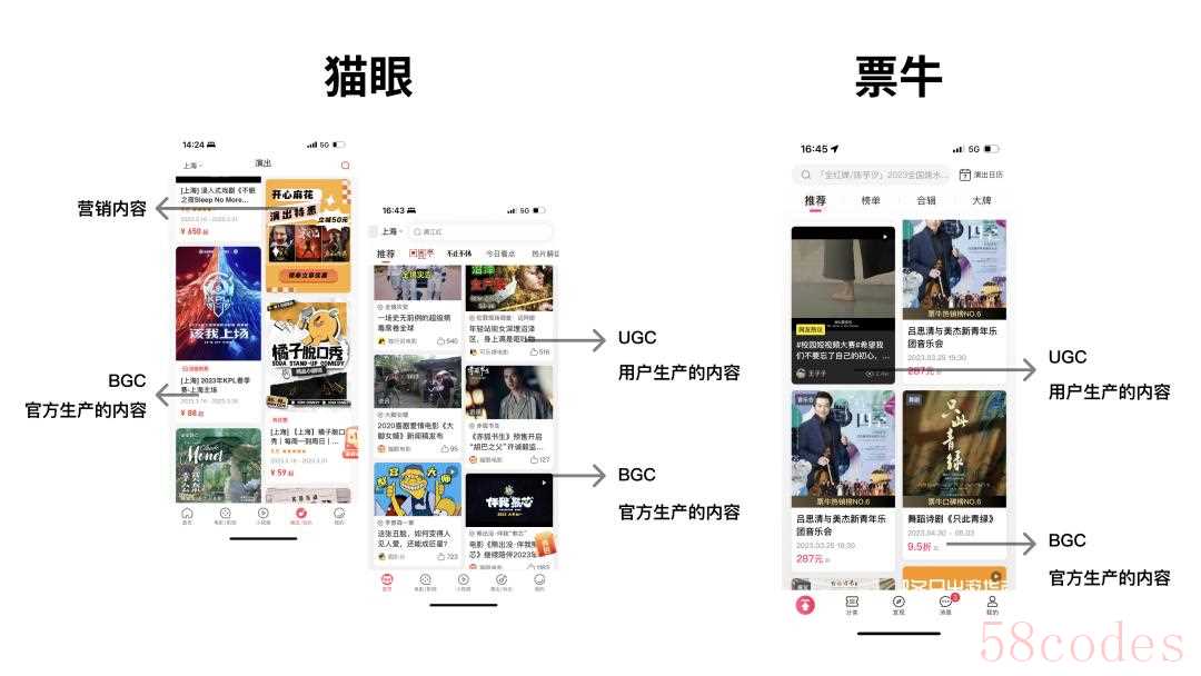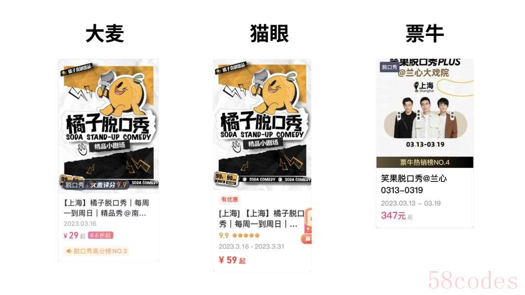 1)在卡片内容中,价格应该是最重要的因素,从视觉上看,大麦的价格因为环绕着众多的标签,显得不那么突出;对比猫眼和票牛,他们的标签离价格都比较远,不受干扰,又是位于最底部的,更容易引起注意。