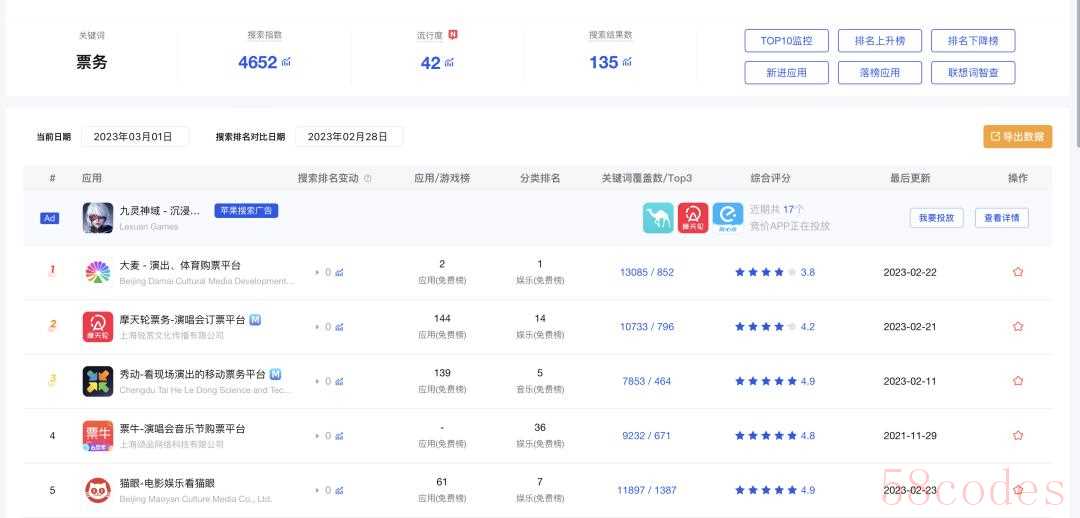 2023年3月1日根据点点数据搜索关键词“票务”,排行前五的app为“大麦”“摩天轮”“秀动”“票牛”“猫眼”;根据易观千帆截止2020年6月30日的数据,“大麦”的月活166.60万,日活14.76万,“摩天轮”的月活18.79万,日活1.18万,“秀动”的月活10.82万,“票牛”的月活6.33万,“猫眼”的月活303.43万,日活39.58万。