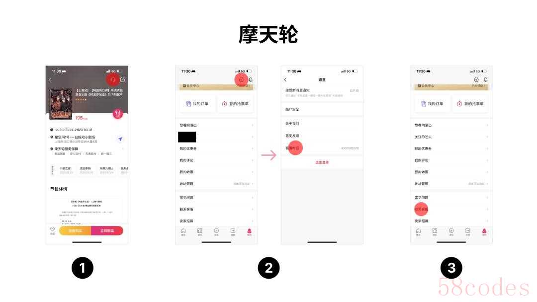 分别在3个场景中有客服入口:购票详情页的右上角、底部Tab“消息”中的客服入口、设置中“在线客服”。
