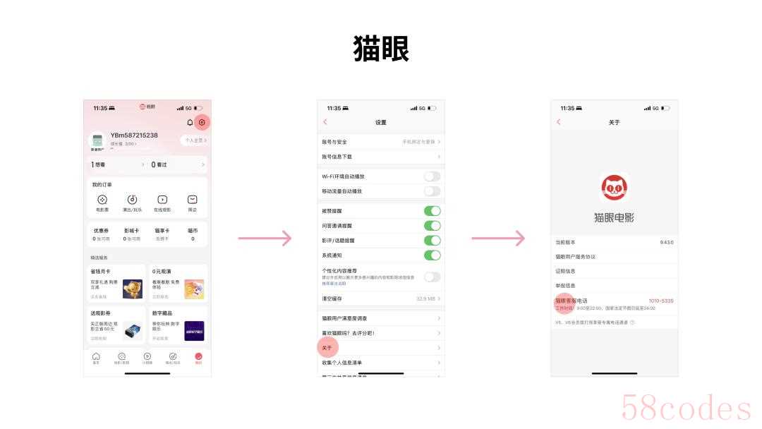 目前只有一个地方可以找到客服入口,并且只有电话形式,没有在线的形式:“我的”-“设置”-“关于”-“猫眼客服电话”。这个入口藏的比较深,用户不容易找到。