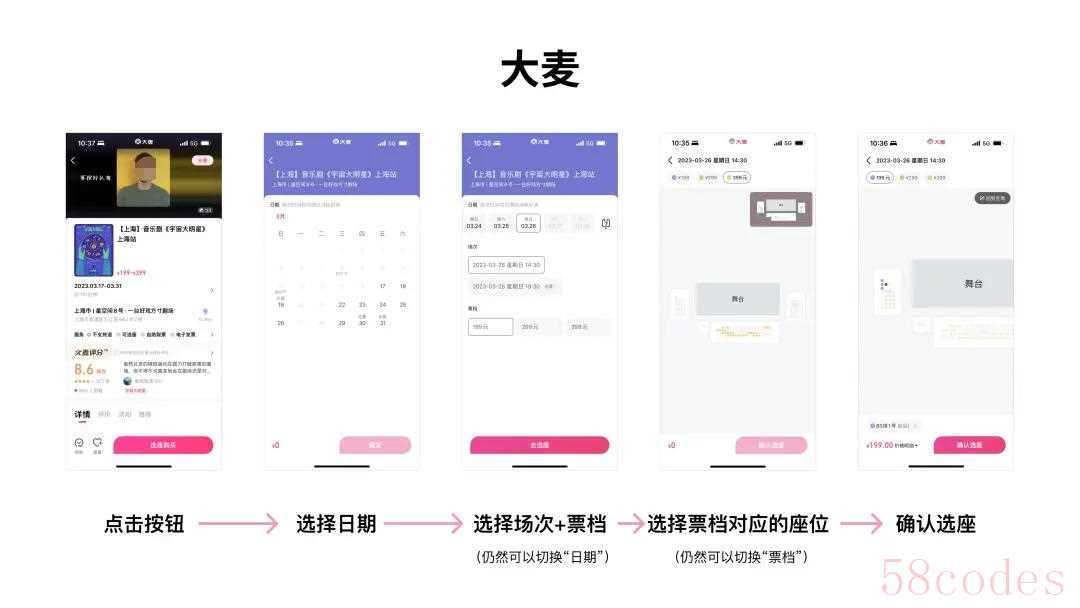 大麦是通过区别CTR的文字,如果有座位可选的演出,底部的CTR按钮为“选座购买”,如果演出没有座位提供,那么底部的CTR按钮为“立刻购买”。