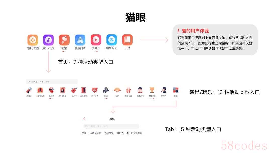 也许票牛是想要突出强调上面的热门演出类型,但是这里容易引起用户的疑惑,明明都是演出类型,为什么要做差异化?而且视觉上的不一致带来一种不舒服不和谐的感觉。