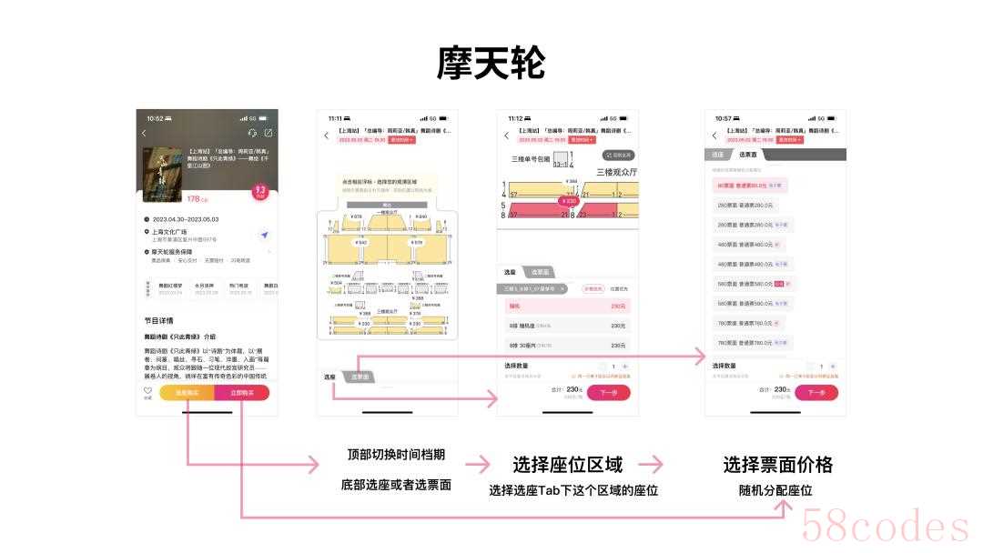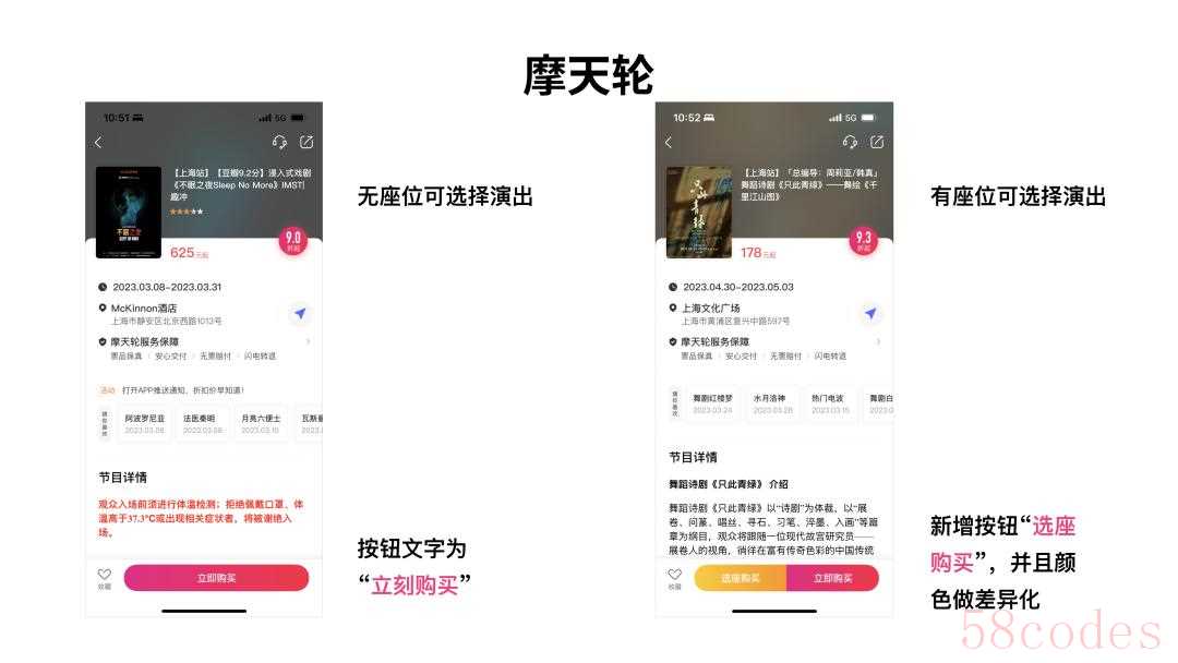 - 摩天轮:在演出列表界面,卡片标签“可选座”;在详情页,无标签提示,但是底部按钮,比不可选座新增了一个,非常明显了。