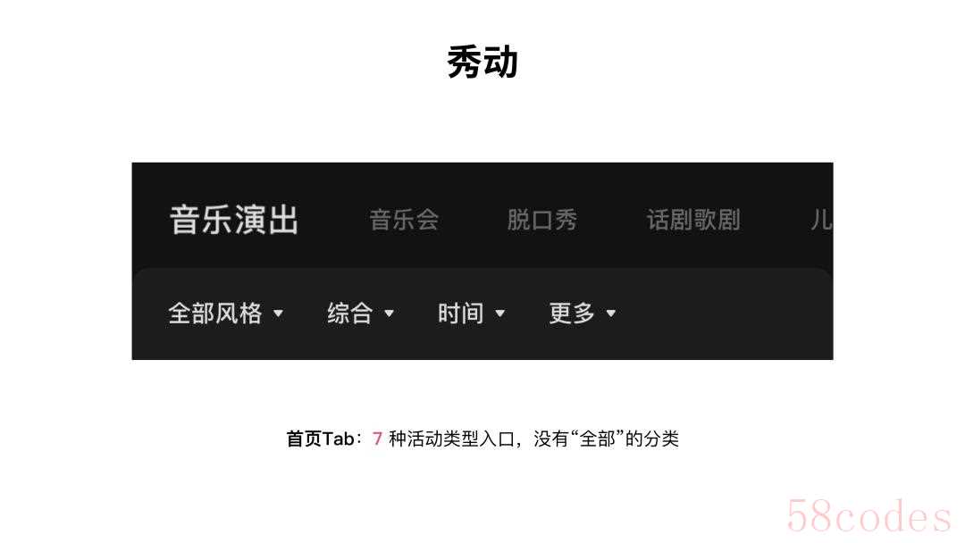 我们看到,猫眼提供的活动分类最多,有15种,秀动提供的活动分类最少,只有7种,而且往往首页会露出较为热门的演出类型,不会全部露出。