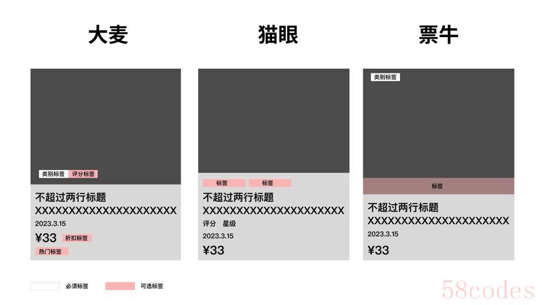 我们看到大麦的标签有三个位置可选:图片的左下角,价格的右边,价格的下边;猫眼的标签位于标题上方;票牛的标签有两个位置可选:图片底部(宽度与图片同宽),图片左上角。