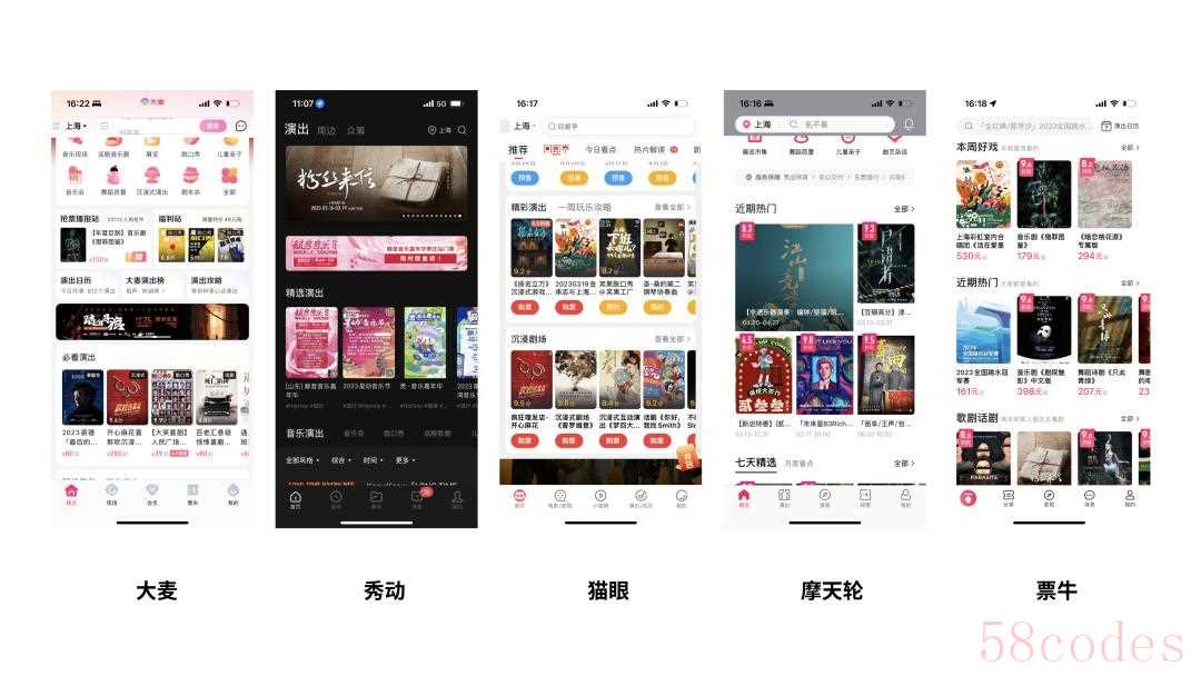 - 大麦(13种):抢票播报站、福利站、演出日历、大麦演出榜、演出攻略、必看演出、即将开售、预售早鸟、你想看的、24小时演出、为你推荐(Feed流)、高分榜、周末约。