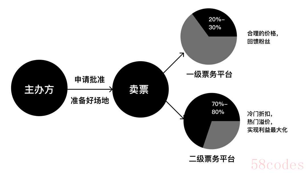 主办方将艺人的表演作为商品进行发售,在申请批准、准备好场地后,开始卖票,他们会将20-30%的票分发给一级票务平台定价发售,通常来说这些价格是较为合理的,用来回馈粉丝用户,剩下的70%-80%的票会分发给二级票务平台,通过市场机制调整价格,如遇到供不应求的情况,价格抬高,也就是冷门折扣,热门溢价,以此实现利益最大化。