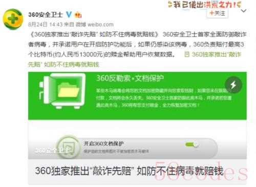 为了进一步降低敲诈者病毒带来的损失,8月25日,360安全卫士独家推出了“反勒索服务”。用户在开启文档保护功能和反勒索服务功能的情况下感染敲诈者病毒,360将替用户缴纳最高3个比特币的赎金,并协助用户还原被加密文件。