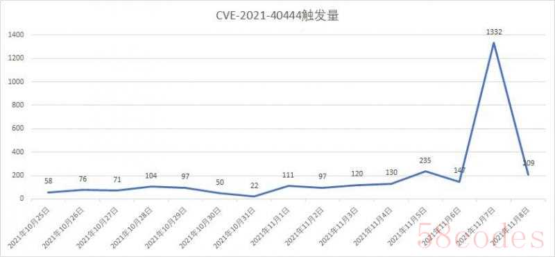 据360安全卫士数据显示,该黑客团伙于今年9月份开始投放带有CVE-2021-26411漏洞利用代码的广告,11月5日开始,攻击者增加了投放带有CVE-2021-40444漏洞利用代码的广告。360安全大脑的监测数据显示,自11月5日起,360每天拦截到的触发了此次攻击指令的设备,就有约20台/次。