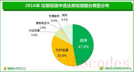 而在违法类垃圾短信中,赌博类短信的占比最高,为47.0%,其次为代开发票类垃圾短信35.6%、办证刻章(5.9%)、复制电话卡(1.9%)、色情信息(0.6%)。相较于往年,代开发票的短信有所减少,但赌博类依然保持“第一阵营”。
