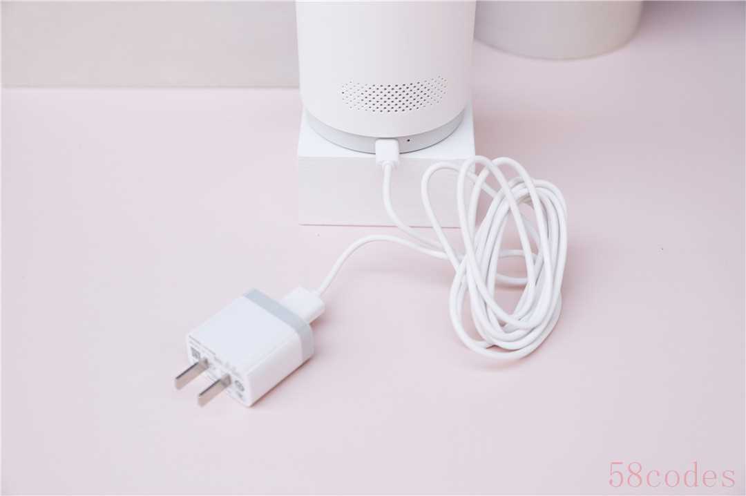 将附带的电源和电源线插上摄像机,就可以使用了,连接很方便,附带的电源线和电源插头都为白色,如果是挂在家里的墙上,也不会显得扎眼。