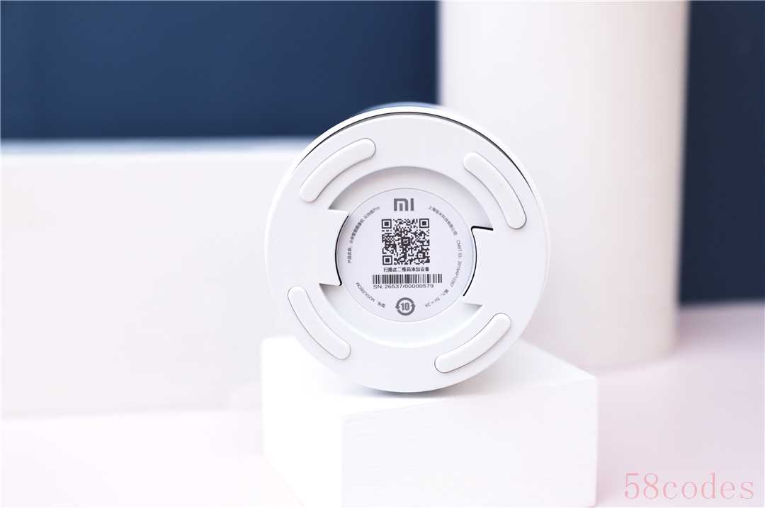 小米智能摄像机云台版Pro的底部,有米家APP的二维码、防滑垫和挂墙卡扣。四个防滑垫,放置在桌子上,更加牢固,不易滑动,挂墙卡槽可以配合附带的墙壁固定卡扣,可以挂在墙上,也可以倒挂在屋顶上,非常的方便。