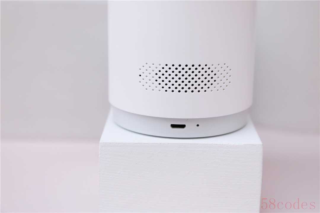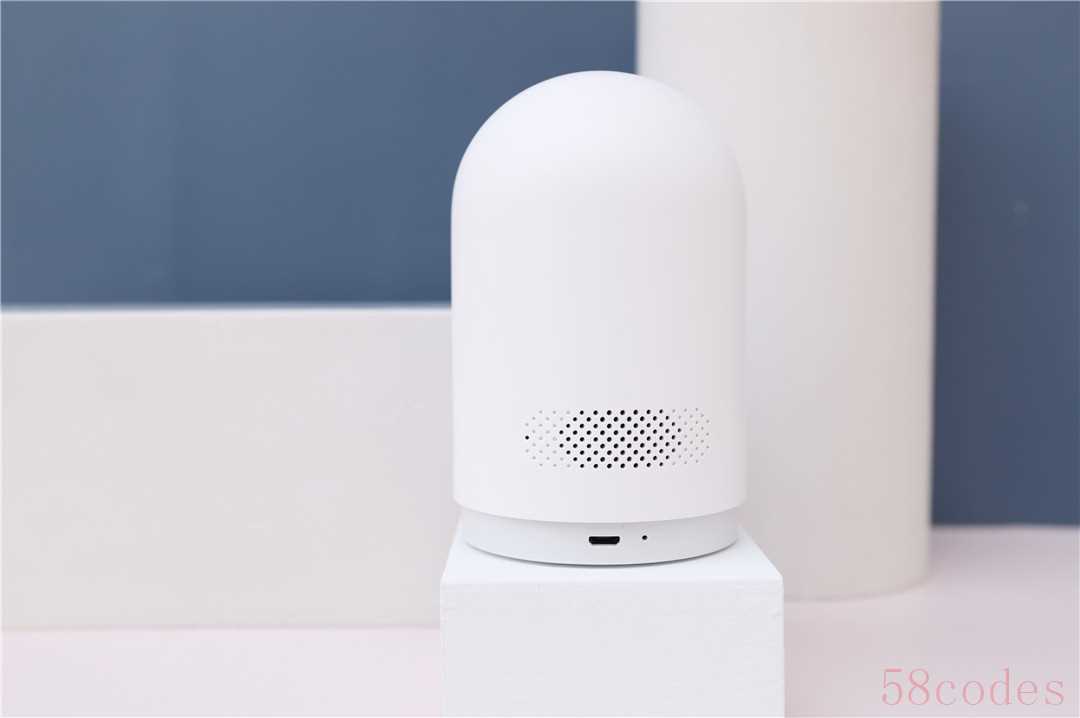 这款摄像机,整体形态看起来非常的可爱,有点像一只企鹅萌萌的,机身呈一个圆柱体,但上半部分,非常的圆润,整个机身为白色,正面底部有一个"MI"字LOGO,摄像头部分为黑色,可以上下调节。