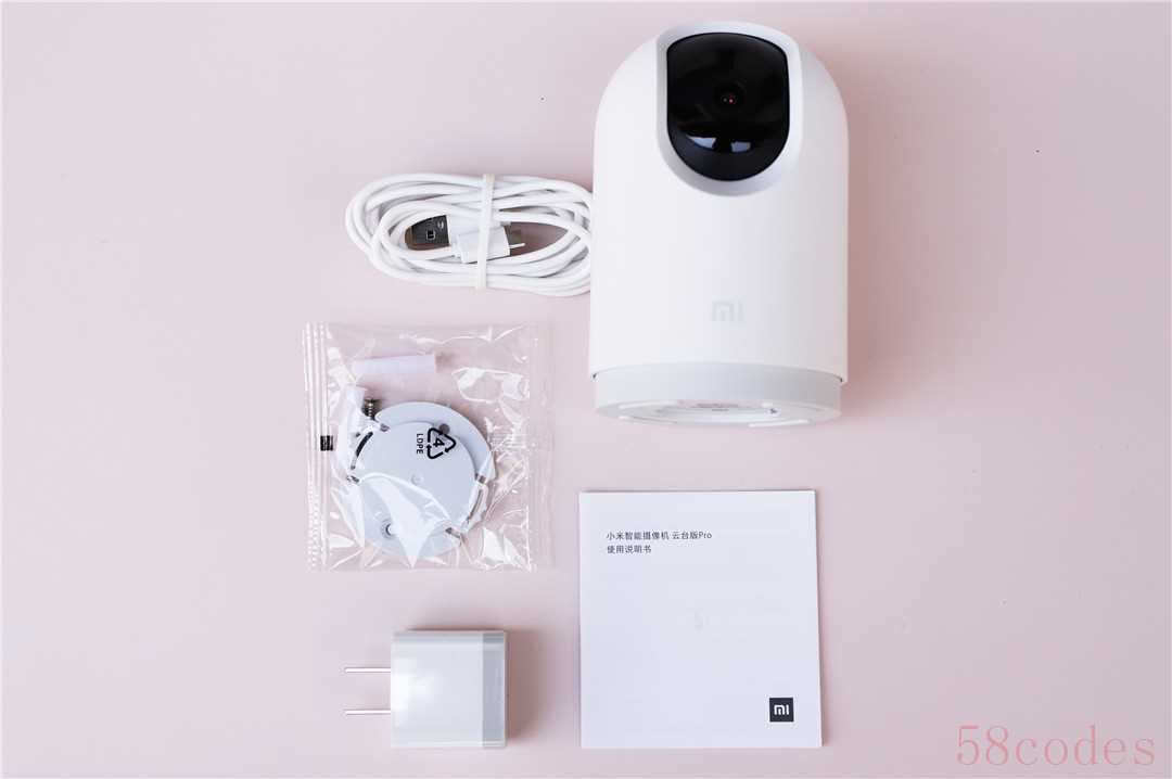 打开小米智能摄像机云台版Pro的包装盒,取出全部配件,我们可以看到这款摄像机的配件还是蛮丰富的,相对于之前买的摄像机,这款摄像机,附带了一个电源插口,这样的话,就不用手机插头或者单独购买一个插头进行供电了,除了摄像机主体,有充电线、充电插头,墙壁固定卡扣以及说明书。