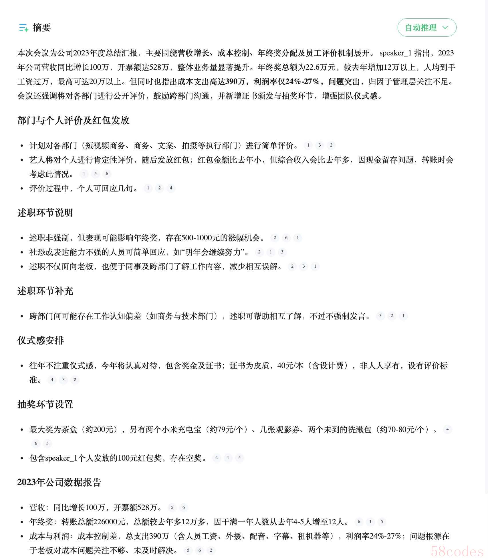 而且从结束录制,到生成会议纪要只用了不到两分钟的时间,这可比自己从录音笔中一句一句总结要快多了。