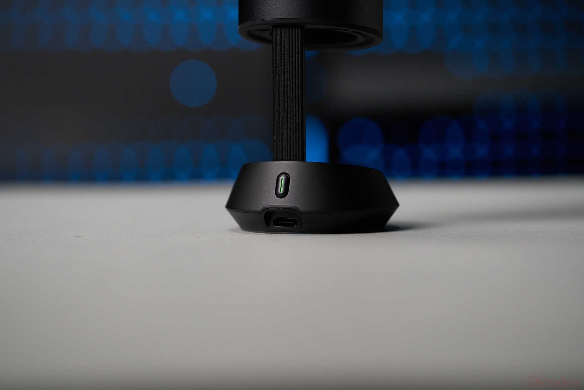 机身正面有一条发光LED灯带,在不同工作状态下会发出不同颜色的光,例如日常为绿色灯光,录制中为蓝色灯光,关闭麦克风时为红色灯光,整体还是起到一个提醒和装饰的作用。