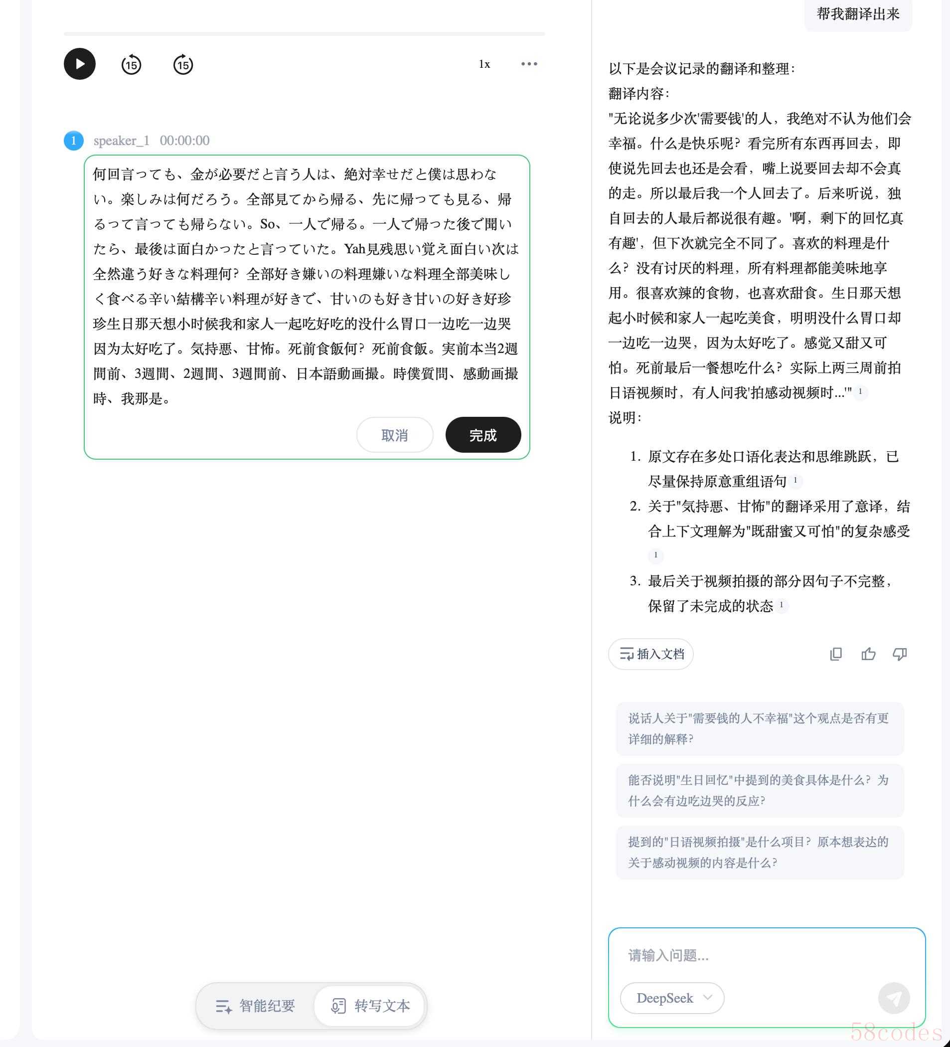 针对不同的语种问题,雷科技先后测试了最常见的英语、日语,都准确识别并生成相关字幕,你甚至能通过自带的AI助手生成相应的翻译文案,主打一个「服务到位」。