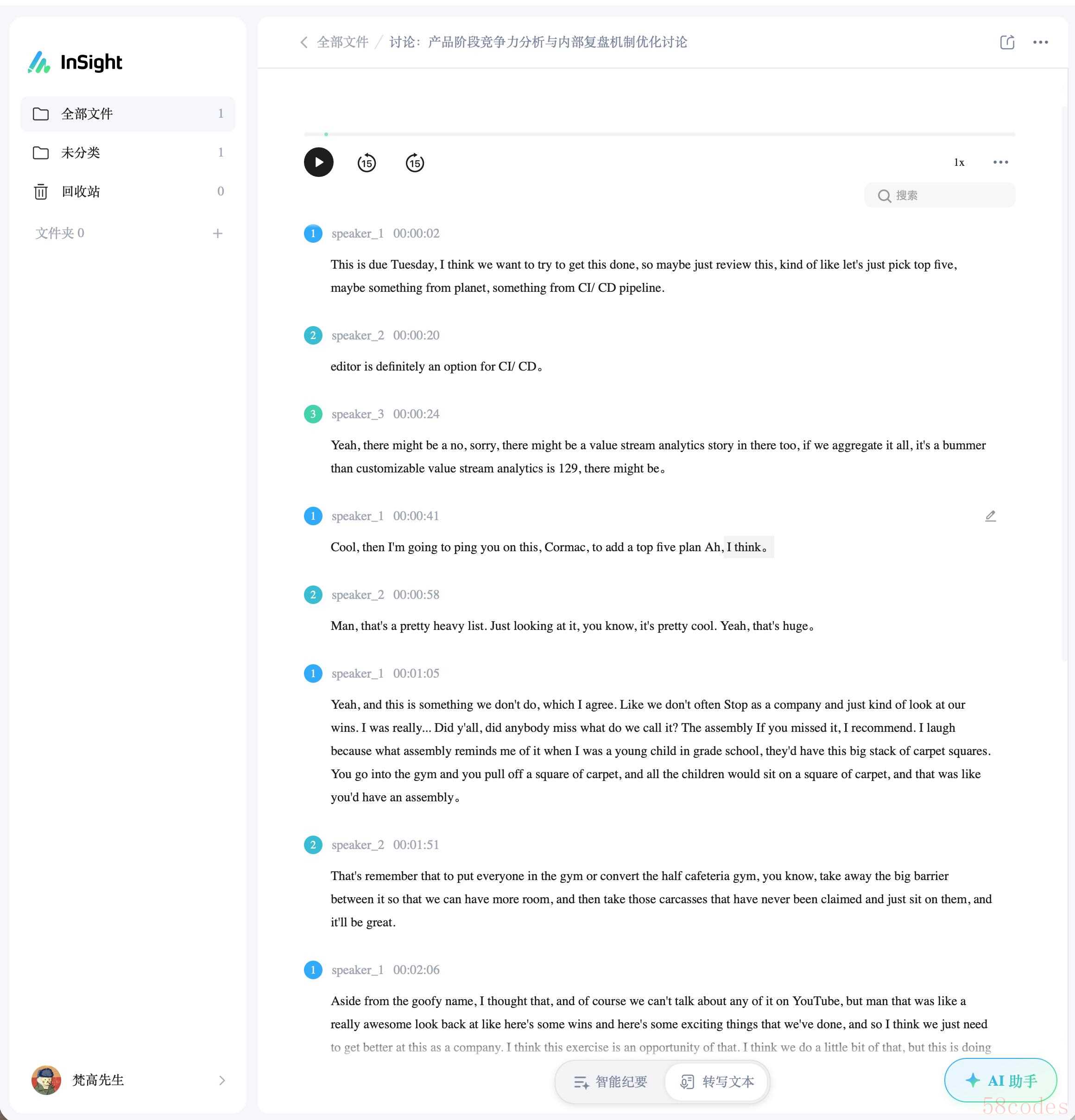 当然,影石Insta360 Wave也会实时生成发言记录,并通过声纹识别将不同的发言人分隔开来,你甚至还可以对这些发言人进行备注。