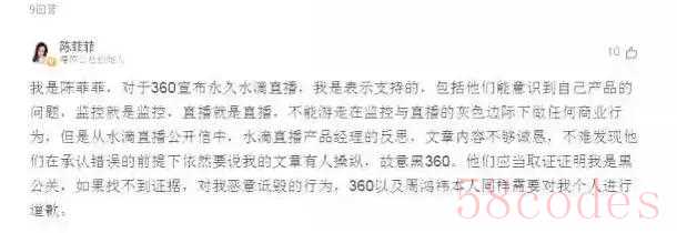 在360宣布永久关闭水滴直播后,陈菲菲回应称表示支持,他们能意识到自己产品的问题,监控就是监控,直播就是直播,不能游走在监控与直播的灰色边际下做任何商业行为。