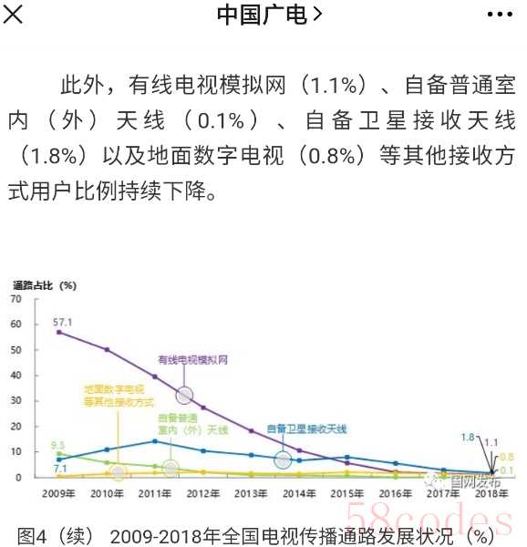 广电总局透露,截至2019年底全国有线电视总用户为2.16亿户。而中国广电公布的数据显示,截至2018年底有线电视模拟网的占比仅有1.1%,且还在持续下降中。